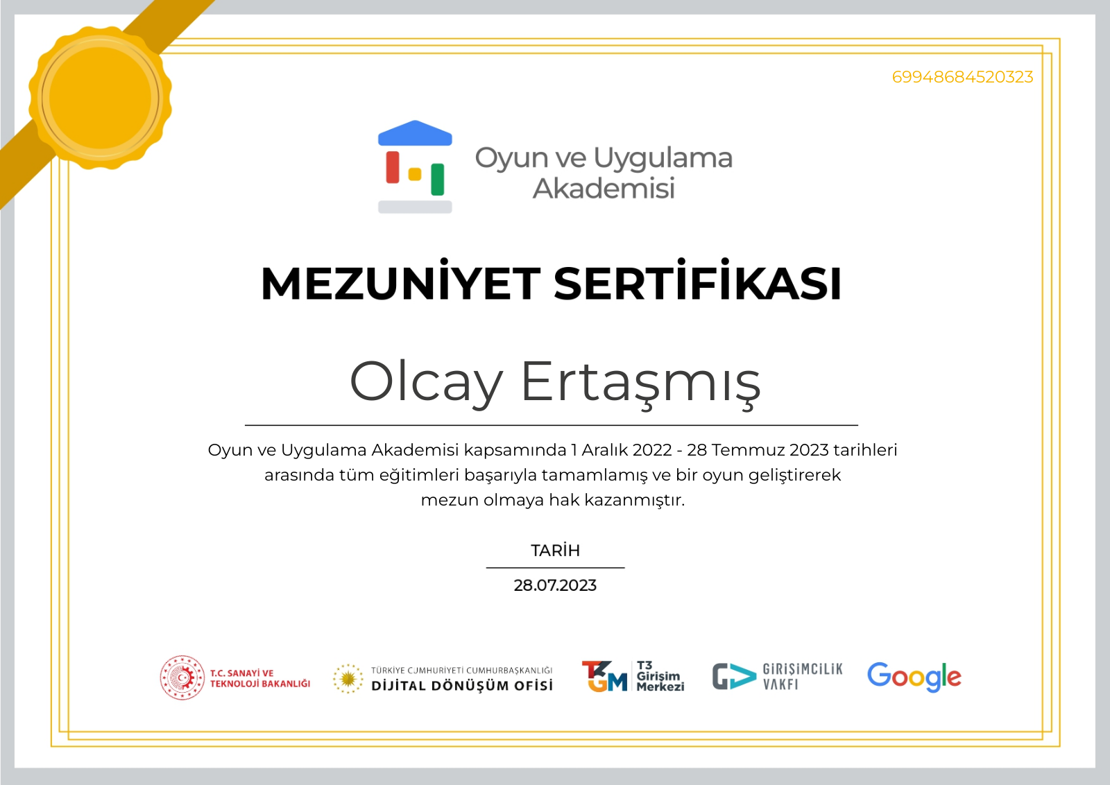 I graduated from the Game and Application Academy, which was implemented with the support of the Ministry of Industry and Technology and the Presidential Digital Transformation Office, in cooperation with Google Turkey, the Entrepreneurship Foundation, and the T3 Enterprise Center.