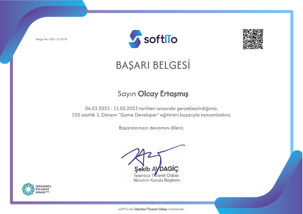 Successfully completed 320-hour Game Developer Academy training supported by the Istanbul Chamber of Commerce (İTO). Built on foundational knowledge and skills from the Basic Competencies program. Gained expertise in Unity, C# scripting, game mechanics, and user interfaces.